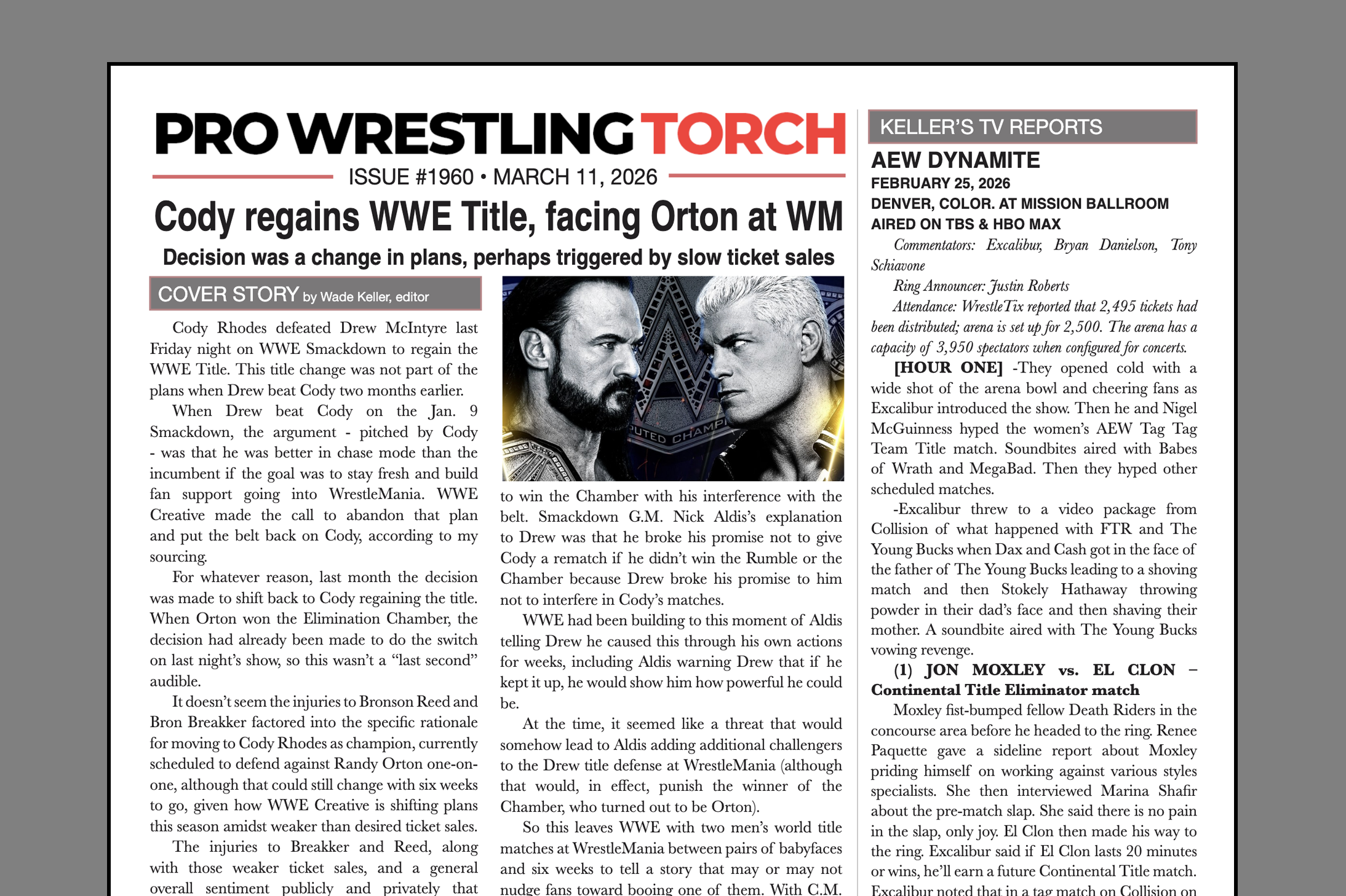 VIP NEWSLETTER – PRO WRESTLING TORCH #1960 (Mar. 11, 2026): Keller’s cover story on Cody beating Drew for WWE Title, Parks column on potential Cody heel turn, Keller’s TV reports, Newswire