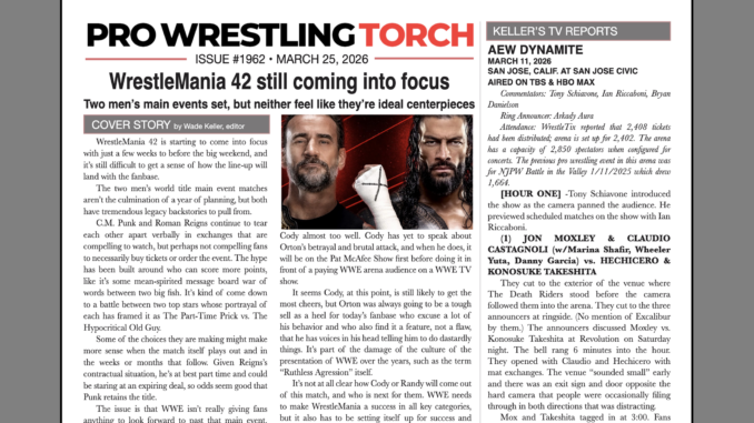 SUMMARY: This week’s PWTorch Newsletter features Wade Keller’s Cover Story on WrestleMania 42 line-up in progress… Greg Parks column on Hangman’s stipulation options… Keller’s TV reports… More…