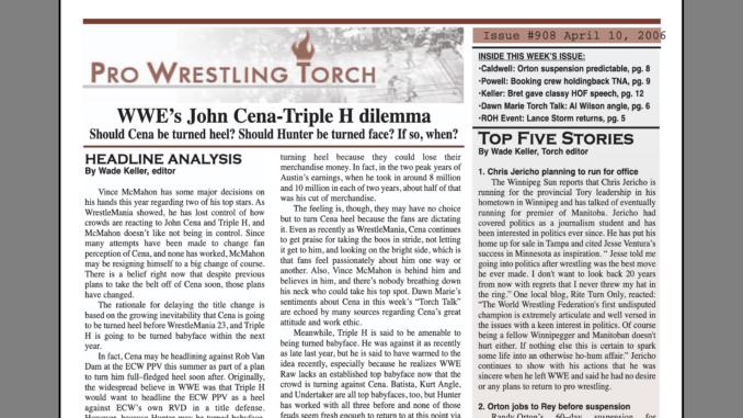 SUMMARY of #908 cover-dated April 10, 2006: This week’s 12 page newsletter features a cover story on the John Cena-Triple H dilemma that Vince McMahon faces this year… An expanded WWE Newswire features insider backstage news on a variety of topics from WrestleMania weekend including the Hall of Fame, Joey Styles, the Steve Austin-Hulk Hogan situation (work or shoot?), ECW pay-per-view news including various potential main events, and an expanded notebook section… The Big Story on TNA Impact… The eighth and final installment of the Torch Talk with Dawn Marie with her thoughts on Eddie Guerrero, the Al Wilson storyline, TNA prospects, WWE locker room leaders, and more… Jason Powell’s feature column say TNA’s stagnant booking is holding back the promotion… James Caldwell interviews a subject of Randy Orton’s backstage misbehavior for his feature column on Orton’s suspension… Wade Keller’s End Notes features his thoughts on the Hall of Fame including Bret Hart’s speech, Eddie Guerrero’s presentation, Steve Austin’s shot at Hulk Hogan, and more… In-depth ROH Live Event reports… 1996 Backtrack with a columnist’s predictions on the futures of Shawn Michaels, Chris Benoit, and Eddie Guerrero… Raw Read Reax… The Top Five Stories of the Week…