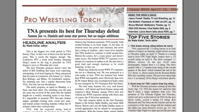 SUMMARY of #909 cover-dated April 15, 2006: The cover story details TNA’s first Thursday night show, what did and didn’t come together, how much star power they have and analysis of whether it’s enough, and more… WWE Newswire includes Francine’s direct response to Dawn Marie’s “Torch Talk,” the latest on Randy Orton, the announced 2006-’07 PPV schedule, and more… TNA Newswire has the latest on Jushin Liger being removed from Lockdown and more… ROH Newswire includes comments from ROH wrestlers on the latest events and the latest news from the promotion… Bruce Mitchell’s feature column titled “McMahon Mystery Theater”… Pat McNeill’s latest column looking back at WWE in 1986 through 24/7… Jason Powell reviews the latest wrestling-related reality shows… Wade Keller’s “End Notes” dissects the pace of the latest TNA Impact program… A Torch Interview with Lance Storm talking about his ROH experience, retirement, his future, and training wrestlers… 1996 Backtrack includes highlights of a Vince McMahon interview on the battle with WCW… Keller’s in-depth ROH DVD Review - Final Battle 2005 – plus the Torch staff Roundtable Reviews of the show headlined by the Match of the Year candidate Low Ki vs. KENTA… Raw Roundtable Reviews and Reader Reax for the Apr. 10 show… The Top Five Stories of the Week… Plus the Big Stories on Raw, Smackdown, and Impact…
