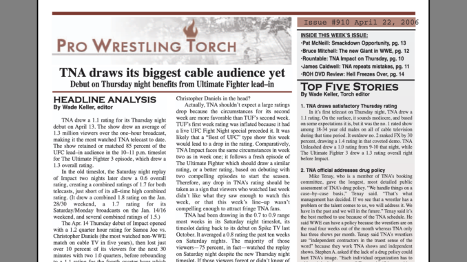 SUMMARY of #910 cover-dated April 22, 2006: The cover story features an in-depth breakdown and analysis of TNA Impact’s ratings last week in the new Thursday timeslot and an overview of the state and future of TNA… ROH Hell Freezes Over DVD review in-depth… Pat McNeill writes that Smackdown needs someone to step up… James Caldwell writes that TNA dropped the ball in their Thursday debut… Bruce Mitchell writes about WWE’s new giant and what’s wrong with the situation… Wade Keller’s End Notes looks at the same old Sting, McMahon’s public perception, and UFC’s big week… In-depth TNA Impact roundtable reviews… Letters to the Editor… WWE Newswire with more insight into the Randy Orton suspension, Steve Austin and Hulk Hogan’s relationship, the inside story on the DX crotch chops, the Joey Styles saga, and more… TNA Newswire with the story on Sabu vs. Samoa Joe this weekend, the Jushin Liger void, and more… ROH Newswire… ETC. Newswire… Backtrack looks at Keller’s analysis of his grading of the Bret-Michaels Iron Man match ten years ago… And more…