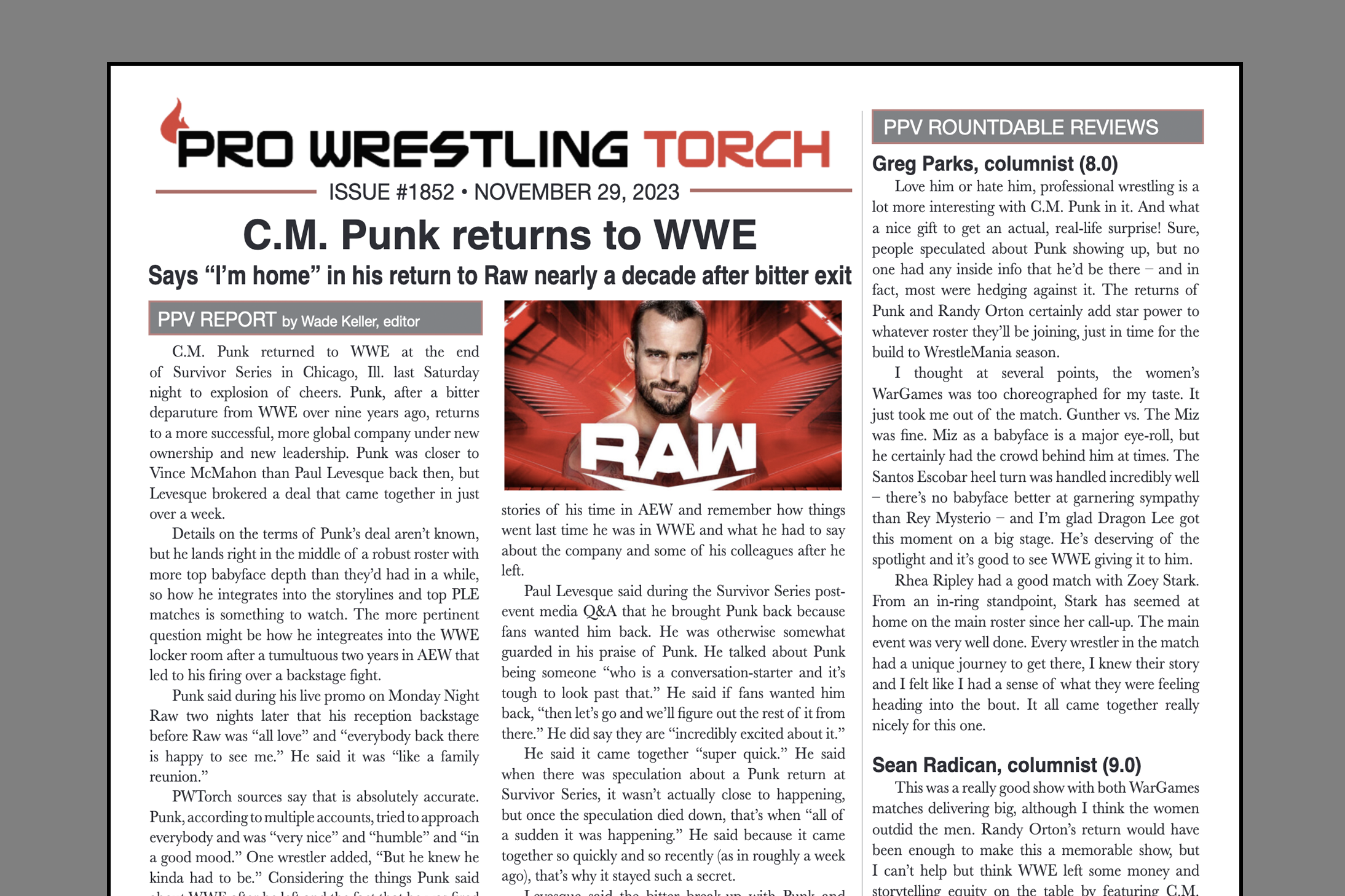 The weekly 12-page newsletter includes newsletter-exclusive Wade Keller cover stories on the biggest story of the week, newsletter-exclusive PPV Roundtable Reviews from the team of columnists, newsletter-exclusive columns from Greg Parks (weekly), plus Rich Fann, Sean Radican, and Alan Counihan on a semi-regular basis.
